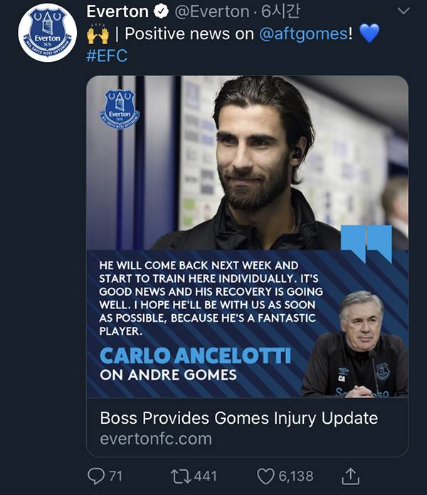 에버턴의 카를로 안첼로티 감독은 “다음 주에 고메스가 훈련장에 돌아와 재활을 시작할 것이다. 좋은 소식이다”라며 그의 복귀를 반겼다.