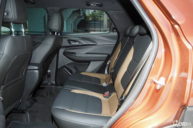 뒷좌석은 공간 면에서 성인에게 크게 부족함 없는 모습이다. 체감상의 공간감을 트레일블레이저의 주적인 기아 셀토스와 비교하자면, 시트포지션과 헤드룸이 약간씩 더 낮은 데 반해, 레그룸과 차내 폭은 거의 비슷한 정도다. 단, 센터터널이 약간 올라 와 있는 편이나, 다리를 두는 데 불편함을 끼칠 정도는 아니다. 특이한 점은 전륜구동 모델을 선택할 경우, 이 센터 터널이 사라지고 거의 평탄면에 가까운 바닥이 주어진다. 그 말인 즉, 더욱 넓은 레그룸을 갖는다는 것이다. 다만 한 가지 아쉬움이 있다면 등받이의 각도가 약간 서 있는 편에 속하고, 리클라이닝 기능이 없다는 점 정도다. 그토록 디테일을 보강한 가운데 리클라이닝 기능이 빠져 있다는 점은 아쉽다.