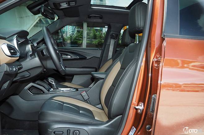 트레일블레이저의 운전석은 차급에 비해 수준급의 착좌감을 제공한다. 시트의 경도는 대체적으로 적당히 탄탄한 느낌이지만 불편함을 느낄 만한 수준은 아니다. 무엇보다도, 마감재로 사용된 가죽의 품질도 나쁘지 않다. 운전석은 8방향의 전동조절 기능과 함께 2방향의 전동식 요추받침 또한 내장되어 있다. 이 덕분에 동생인 쉐보레 트랙스와는 비교도 되지 않는 착좌감을 경험할 수 있다. 조수석은 앞뒤 거리와 등받이 각도만 수동 레버로 조절한다. 앞좌석은 3단계의 열선/통풍 기능이 내장되어 있다.
