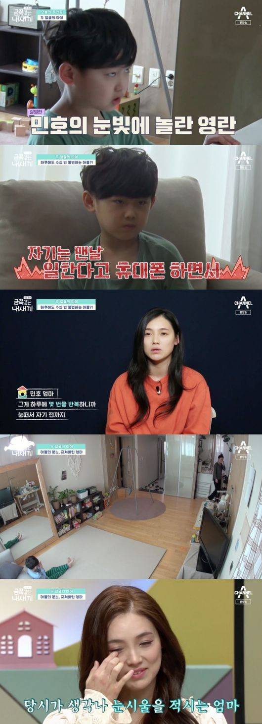 특히 민호의 화는 핸드폰 사용 시에 폭발했다. 숙제를 다 하고 30분 밖에 핸드폰을 사용하지 못한다는 것에 짜증을 낸 것. 민호는 시간이 다 되자 핸드폰을 뺏어가려는 엄마에게 욕을 하는가 하면 핸드폰을 거실 바닥에 패대기쳤다. 이어 엄마를 살벌한 눈빛을 쏘아보며 "자기는 맨날 핸드폰 한다고 하면서"라고 소리 질렀다. 심지어 엄마를 향해 폭행하는 시늉까지 했다. 그는 "엄마가 날 나쁘게 키웠으니까 내가 좀비 영상을 보는 거다"라고 짜증을 내며 화를 주체하지 못했다.