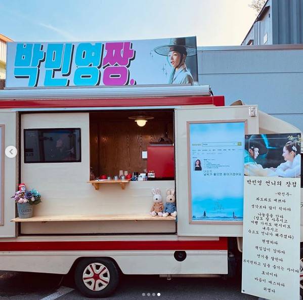 공개된 사진 속 박민영은 박진주가 선물한 커피차 앞에서 인증샷을 찍고 있다.