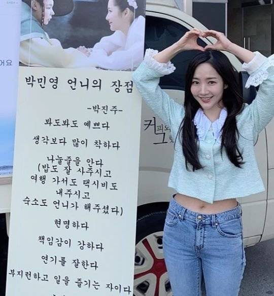 공개된 사진 속 박민영은 박진주가 선물한 커피차 앞에서 인증샷을 찍고 있다. 짧은 민트색 재킷을 걸친 박민영은 머리 위로 하트를 그려 박진주에게 애정을 드러냈다. 빼꼼 드러난 박민영의 군살 없는 허리도 눈길을 끈다.