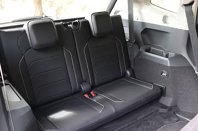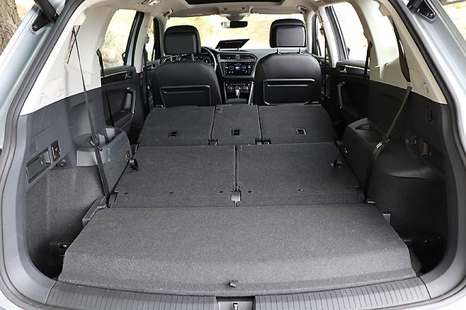 트렁크 적재 용량이 티구안 대비 85리터 늘어난 것이 포인트다. 2, 3열 시트를 접을 경우 최대 적재량은 기본 700리터(3열 폴딩 시) 에서 1,775리터 (2, 3열 폴딩 시)로 늘어났다. 티구안보다는 넓지만 5인승 올스페이스보다는 좁다. 2, 3열 시트를 접어 풀 플랫으로 해 다양한 용도로 사용할 수 있다. 트렁크 플로어 아래에는 임시 스페어 타이어가 있다.