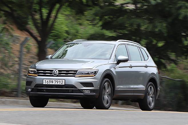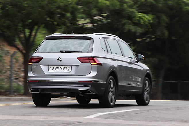 다시 오른발에 힘을 주면 속도계의 바늘은 꾸준히 상승한다. 공차 중량이 티구안 5인승이 1,691kg이고 올 스페이스 7인승이 1,797kg으로 106kg 더 무겁다. 출력 대비 중량이 12kg/ps이므로 세단과는 다르지만 5인승의 느낌과 뚜렷이 다르지는 않다. 그보다는 전체적인 밸런스를 중시하는 트렌드에 걸맞는 수준이다. 최고속도 영역에서는 출력의 한계가 보이는 것도 마찬가지이다. 같은 엔진을 탑재한 아테온은 190마력 사양이 탑재되어 있다.