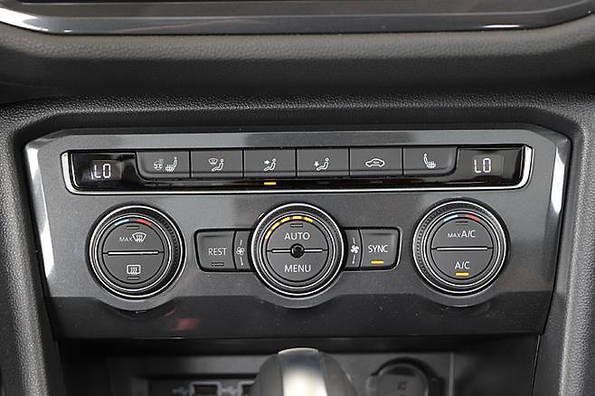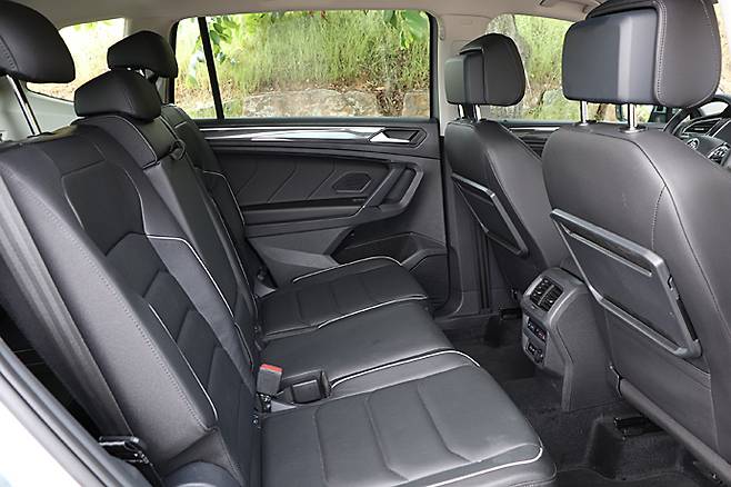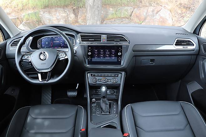 인테리어는 티구안과 크게 다르지 않다. 수평 기조의 대시보드가 전체 분위기를 주도한다. 대시보드를 가로지르는 에어벤트를 비롯한 각종 패널도 직선 위주의 디자인이다. 폭스바겐 그룹의 프리미엄과 럭셔리 브랜드들은 세 개의 터치 스크린을 사용하면서 규모의 경제 혜택을 누리고 있다. 하지만 양산 브랜드 패밀리카인 티구안은 아날로그 감각이 남아 있다.