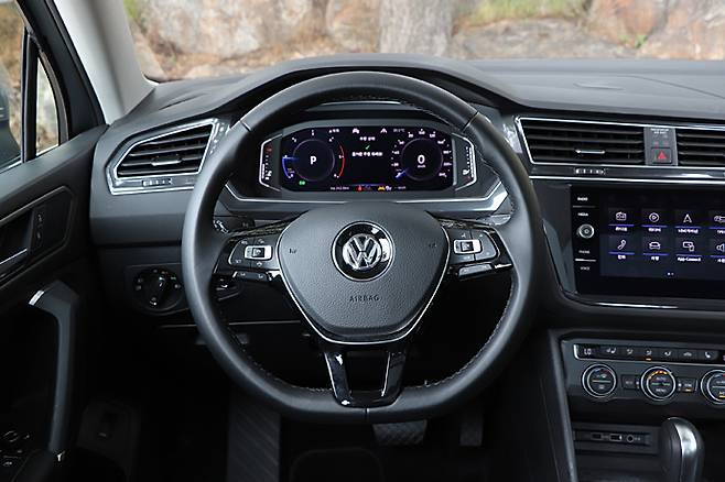 수동 틸팅&텔레스코픽 기능의 3스포크 D컷 스티어링 휠은 신세대 폭스바겐의 그것이다. 스포크상의 버튼류가 일목요연하게 배치되어 있고 조작성도 좋다. 그 안으로 보이는 계기판은 TFT액정 디스플레이라는 점은 같은데 올 초 시승한 아날로그 타입이나 2세대 티구안 데뷔 당시의 것과는 전혀 다르다. 스티어링 휠 오른쪽 스포크상의 VIEW버튼으로 세 가지 화면을 표시할 수 있다. 아우디 버추얼 콕핏처럼 풀 컬러 내비게이션 지도를 표시하지는 않는다.