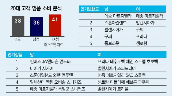 ▶1020대의 ‘명품 사랑’…입문은 저렴한 명품으로=밀레니얼 세대(1980~2000년대 출생)는 비교적 이른 나이에 명품 소비에 입문한다. 수백만원에서 수천만원에 이르는 고가 명품을 사는 대신 비교적 ‘가성비(가격 대비 성능)’가 높은 명품을 구매하는 것으로 시작한다. 명품 브랜드를 판매하는 온라인몰 ‘머스트잇’에 따르면 20대 고객은 전체 고객의 55.4%를 차지한다. 20대 여성과 남성 고객의 객단가는 각각 41만원, 36만원으로 비교적 낮은 편이다.