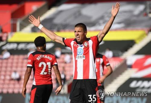 epa08509144 Southampton's Jan Bednarek reacts during the English Premier League soccer match between Southampton FC and Arsenal FC in Southampton, Britain, 25 June 2020. EPA/Mike Hewitt/NMC/Pool EDITORIAL USE ONLY. No use with unauthorized audio, video, data, fixture lists, club/league logos or 'live' services. Online in-match use limited to 120 images, no video emulation. No use in betting, games or single club/league/player publications.