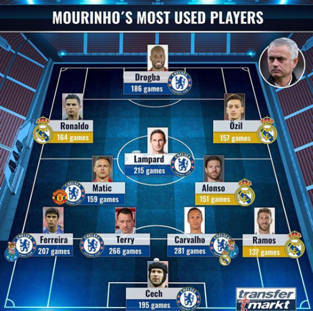 이밖에도 첼시와 포르투에서 무리뉴 감독의 총애를 받았던 파울루 페헤이라(207경기), 첼시의 중심이었던 프랭크 램파드(215경기), 페트르 체흐(195경기), 디디에 드로그바(186경기), 맨체스터 유나이티드와 첼시에서 무리뉴 감독을 따랐던 네마냐 마티치(159경기)가 집계됐다.