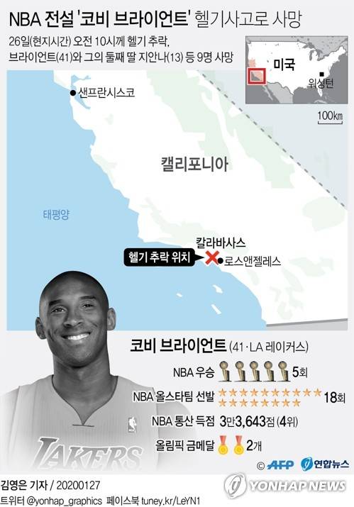 (서울·뉴욕·로스앤젤레스=연합뉴스) 현윤경 기자 이귀원 옥철 특파원 = 미국프로농구(NBA)의 전설적인 스타 코비 브라이언트(41·미국)가 26일(미국 현지시간) 헬리콥터 추락사고로 사망했다고 로이터, AFP통신 등이 미 연예매체 TMZ를 인용해 전했다.