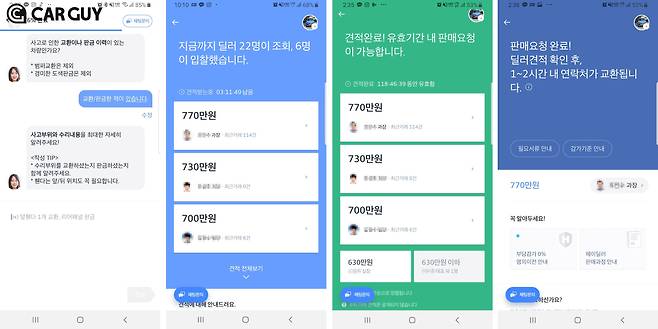 가장 활발한 SNS광고를 펼치는 헤이딜러는 전용 모바일 앱을 통해 손쉽게 신청이 가능했다. 간단한 차량 정보와 함께 옵션 및 파손 여부, 직접 촬영한 차량 사진을 업로드 하면 48시간 동안 제휴 딜러를 통해 실시간 견적을 제공받을 수 있다. 입찰한 딜러 개인의 판매 정보와 평가도 확인이 가능했다. 견적을 비교해보고 합리적인 가격을 제시한 딜러를 선정해 판매 요청을 하면 된다. 신청 및 판매 과정에서 자가 부담 수수료는 없다.