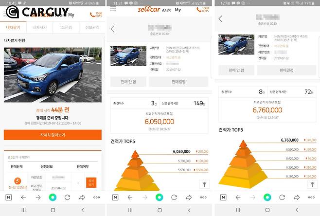 두번째로 찾은 곳은 실시간 경매를 통해 비교견적을 제공하는 AJ셀카다. 헤이딜러와 마찬가지로 모바일 앱이나 웹사이트를 통해 간단한 차량정보를 입력하고 서비스를 요청할 수 있다. 해피콜을 통해 원하는 장소와 일정을 선택하면 된다. 헤이딜러와 마찬가지로 신청과 판매에 요구되는 수수료는 없다. 이전에는 판매 대금의 1.1%(최저 11만원~최대 33만원)를 수수료로 납부해야 했으나 지난해 12월 1일부로 고객수수료를 완전히 없앴다. 수수료를 받으면 사실상 이용을 하지 않아서다.