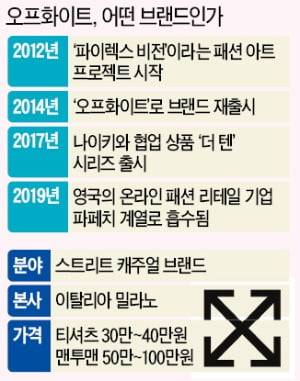 지난 9일 오전 나이키코리아 공식 홈페이지에 사람들이 몰렸다. 한정판 검은색 후드티를 사려는 사람들이었다. 오전 10시에 판매를 시작했다. 몇 분 지나지 않아 모든 사이즈 제품이 품절됐다. 23만9000원에 출시된 이 옷은 같은 날 온라인 중고 시장에서 30만원이 넘는 가격에 거래됐다. 일반 나이키 후드티 가격은 10만원 정도. 이 제품을 두고 웃돈 거래까지 나타난 것은 옷에 찍힌 ‘오프화이트’ 로고 때문이었다.