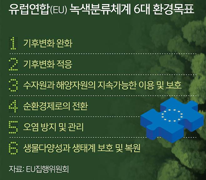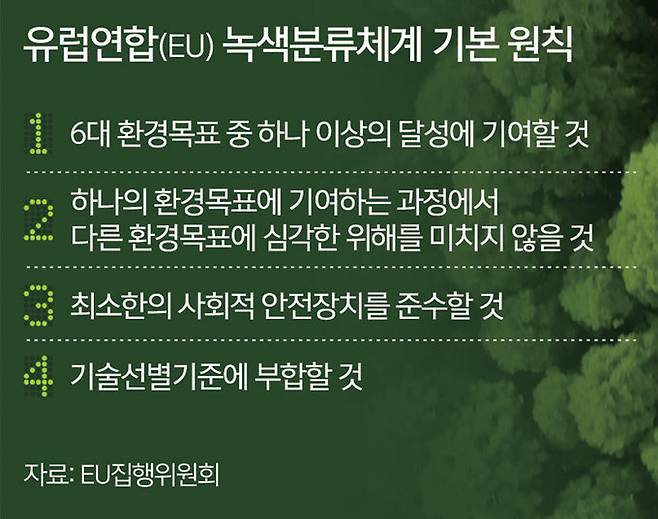 6가지 환경목표에는 △기후변화 완화 △기후변화 적응 △순환경제로의 전환 △생물 다양성 보호 및 복원 등이 포함되며, 이 중 하나를 충족해도 다른 목표에 반하는 사업은 ‘친환경’으로 분류될 수 없다는 것이 골자다. 하나의 환경목표를 달성하기 위해 다른 환경적 위해를 가하면 안 된다는 원칙은 결국 충분히 환경에 기여하고 있는지 살핀다는 것이다. EU는 그외 조건으로 최소한의 사회적 안전장치를 준수하는지 등을 따진다고 제시했다.