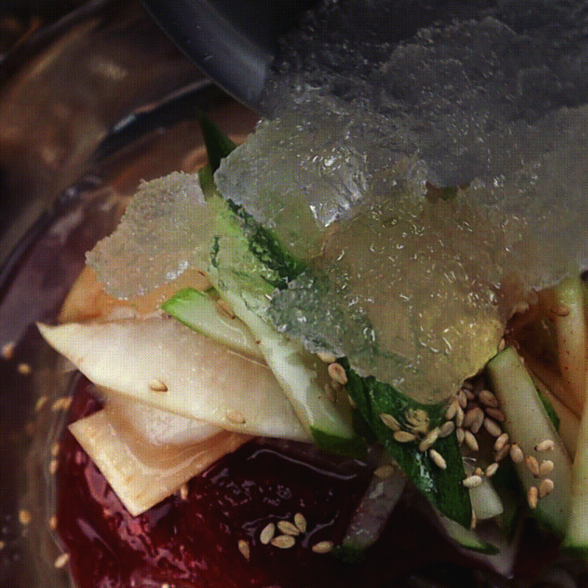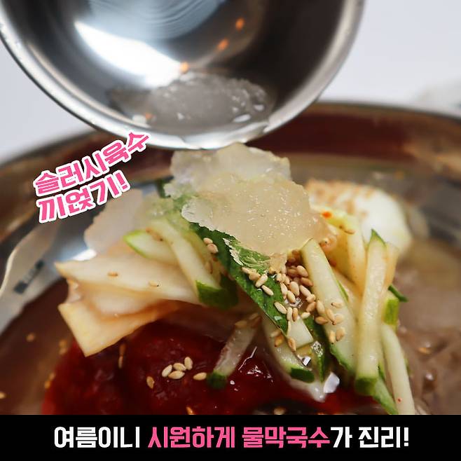 그렇지만 역시 슬러시 육수 벌컥벌컥 들이켜야 뼛속까지 시원해지지 않겠어요? 물 막국수는 살얼음 육수 한 팩 몽땅 부어서 찰랑찰랑하게 완성했습니다!