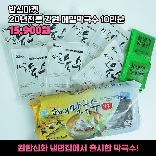 이틀 만에 2800세트를 팔아버리신ㅋㅋ육수와 양념장 그대로 조금 더 도톰한 막국수 면발과 함께 10인분 세트 15,900원에 판매하고 있네요. 1인분 1590원꼴로 함흥냉면 보다 2000원 정도 저렴하네요!