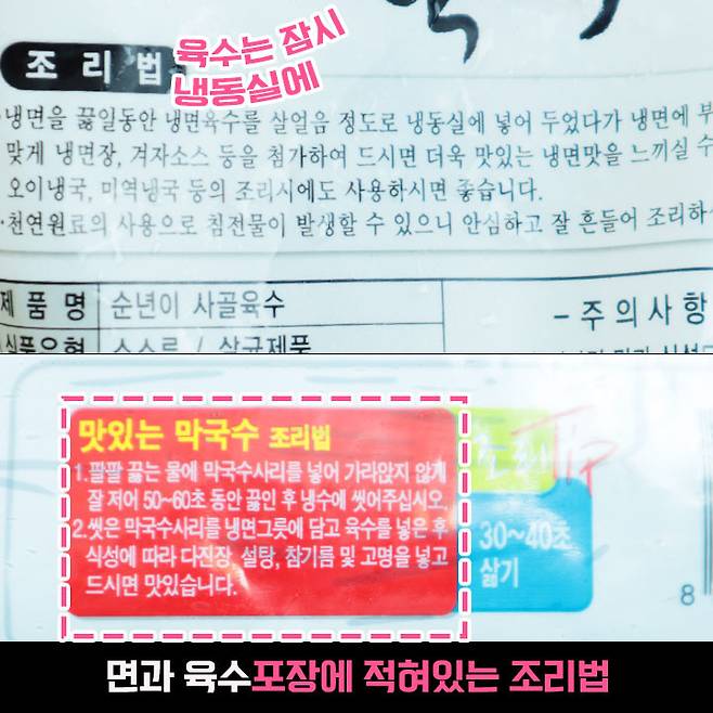 육수와 면발 포장지 뒷면에는 간단한 조리법이 적혀있어요! 여름철엔 역시 살얼음 막국수가 진리죠? 조리를 시작하기 전에 잠시 냉동실에 얼려두어 시원하게 준비해두고, 뜨거운 물 끓여 조리 준비 완료!