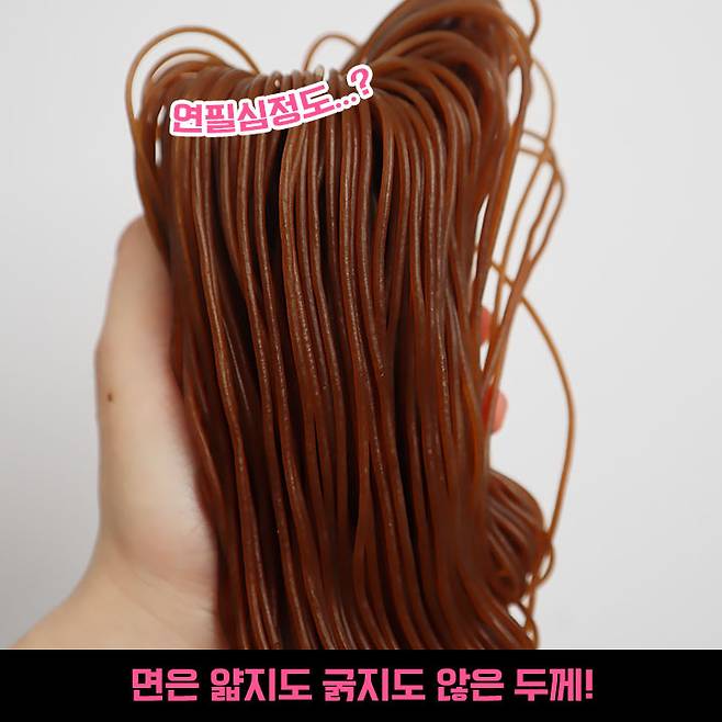 면은 일반적인 막국수 면의 두께로 연필심과 비슷하네요ㅋㅋ 굵지도 얇지도 않은 적당히 씹는맛 있는 두께에요! 면이 바싹 말라있지 않은 걸 보니 전분이 많아 보이는데, 삶으면 굉장히 쫄깃할 것 같아요:-D