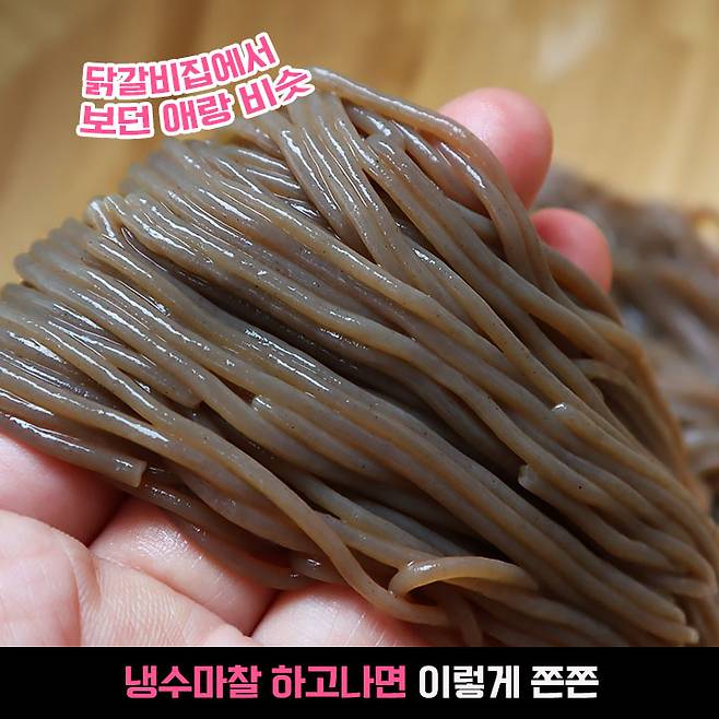 잘 삶아진 면을 냉수에 촥촥 헹궈주고 나니 윤기가 돌면서 굉장히 쫀쫀해졌어요:) 뚝뚝 끊기지 않고 탄력 좋은 질감의 면발이네요. 닭갈비집에서 주문하면 나오는 막국수보다 조금 더 탱글탱글한 느낌?