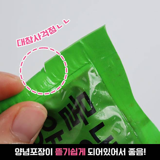 양념장 포장 자체는 질겨서 뜯기 힘든 재질인데, 잘라진 부분이 있어서 저곳을 잡고 개봉하면 아주 쉽게 뜯어져요! 투박하게 잘린 비주얼을 보니 뭔가... 손으로 하나하나 가위질하신 것 같다는 생각이 불쑥 드는데... 이런 센스 너무 좋아요:)