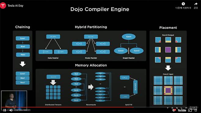 그리고 이번 AI 데이를 통해서는 테슬라의 컴퓨터 칩을 공개했으며, 이 칩은 슈퍼컴퓨터 도조(Dojo)를 운영하는 데 사용하고 있다고 밝혔다. 테슬라의 AI 아키텍처 대부분은 신경망 교육 컴퓨터인 도조에 의존하며 다른 컴퓨팅 시스템보다 방대한 양의 카메라 이미징 데이터를 4배 더 빠르게 처리할 수 있다고 한다. 이 아이디어는 도조가 교육을 받은 AI 소프트웨어가 공중파 업데이트를 통해 테슬라 고객에게 제공될 것이라는 이야기이다.