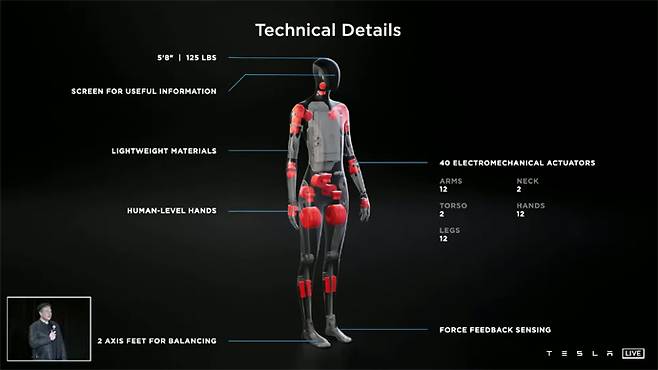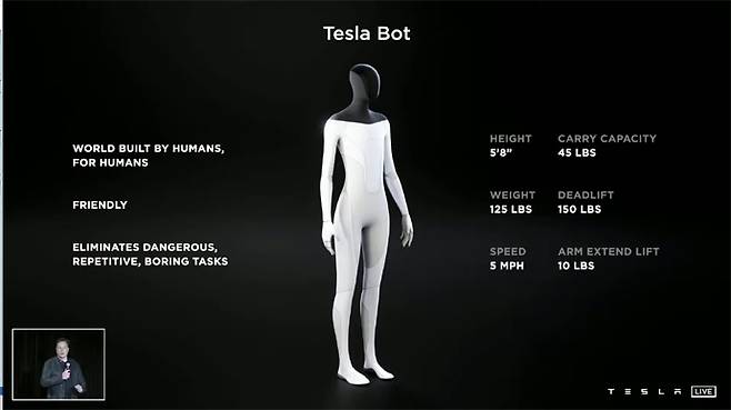 일론 머스크도 사람들이 싫어하는 일을 대신 해 줄 수 있는 휴머노이드 로봇이 빠르게 등장할 것이라며 친절하고 인간을 위해 만들어진 세상을 탐색하기 위한 것이라고 강조했다. 이번에 발표한 테슬라 봇은 125파운드(58kg)를 들어 올릴 수 있고 시간당 5마일(8km)를 이동할 수 있으며 머리 부분에는 정보를 표시할 수 있는 스크린이 있다. 이 기준은 기계적이고 물리적인 수준에서 로봇으로부터 벗어날 수 있고 그것을 압도할 수 있도록 하기 위한 설정이라고 설명했다.