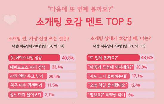 또 9월 17일부터 26일까지 진행한 ‘소개팅 전, 가장 신경 쓰는 것’ 설문에서는 미혼남녀 218명(남 104, 여 114)이 ‘옷과 헤어스타일 점검(40.8%)’과 ‘데이트코스 미리 검색(23.4%)’을 가장 많이 꼽았다.