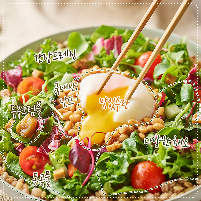 건강식이지만 구하기 어렵고, 질감과 맛이 담백해 자주 접하지 못하는 낫또. 샐러드로 편하고 쉽게 즐겨보는 건 어떨까요? 남녀노소에게 좋은 식물성 단백질과 식이섬유를 간편하게 섭취할 수 있으니까요!