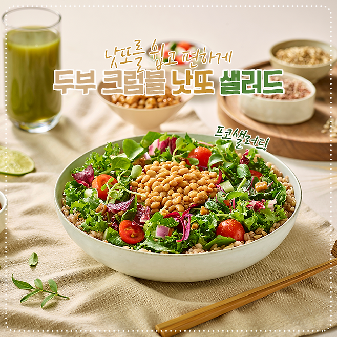 혹시 낫또를 즐기지 않는 사람도, 조금 더 맛있게 먹을 수 있는 방법이 있을까요? 프레시코드의 '두부 크럼블 낫또 샐러드'를 소개해 드릴게요. 낫또를 거부감 없이 먹을 수 있도록 다양한 재료를 곁들였는데요.
