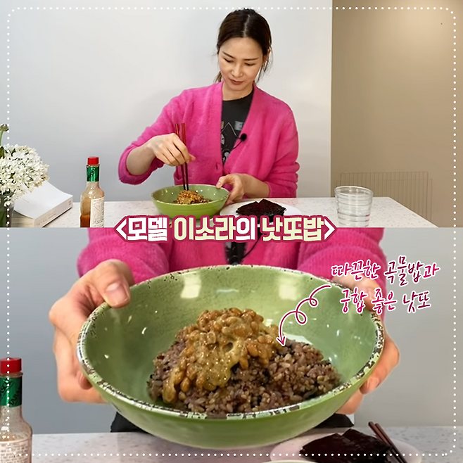 낫또 하면 모델 이소라의 식단도 빼놓을 수 없죠. 제1회 한국 슈퍼모델 선발대회에서 1위를 거머쥔 이소라는 각종 피트니스 프로그램으로 유명해 다이어트의 신이라고 부르는데요. 유튜브 이소라잇을 통해 간편하고 건강한 낫또밥을 소개했어요. 12곡과 오트밀로 만든 밥 위에 낫또를 얹어 먹는 건데요. 김치와 김은 기호에 맞게 곁들여 먹으면 됩니다.