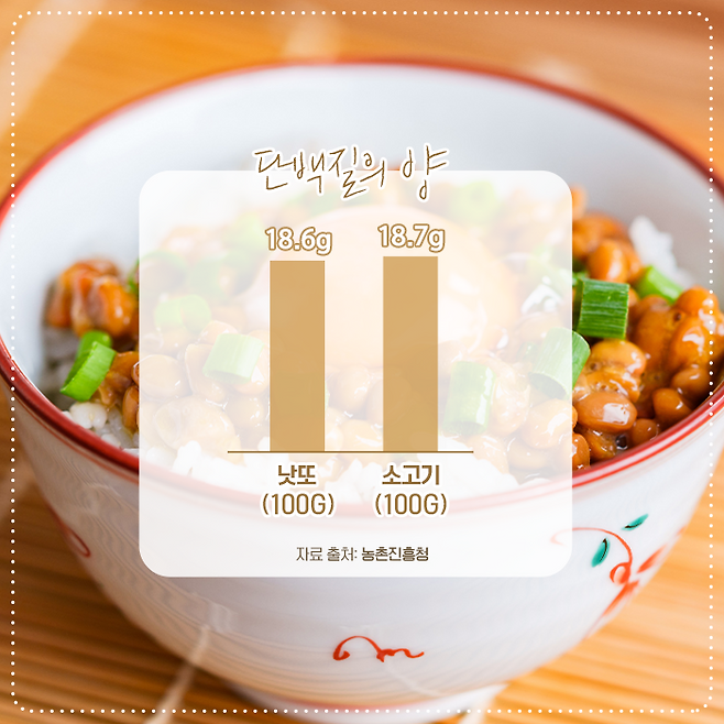 그렇다면 낫또는 여성에게만 좋을까요? 아닙니다. 콩에 함유된 '식물성 단백질'은 남성에게도 매우 좋은데요. 낫또는 단백질 섭취에 탁월한 식품이죠. 농촌진흥청 연구에 따르면 낫또 100g에 함유된 단백질은 18.6, 소고기 100g에 함유된 단백질은 18.7g로 동일한 수준입니다.