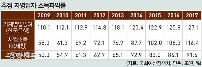 자영업자의 탈세 규모는 ‘추정’만 한다. 정부 통계가 없다. 한국 정부는 자영업 탈세 규모를 측정하는 통계를 따로 생산하지 않는다. 대신 한국은행의 가계영업잉여와 국세청의 사업소득 통계를 비교해 이른바 자영업자 ‘소득파악률’을 추정해왔다. 두 기관의 통계가 동일항목을 담고 있지 않아 정확성은 떨어지지만, 자영업자의 소득신고 수준의 추세 정도는 파악할 수 있는 지표로 꼽힌다.