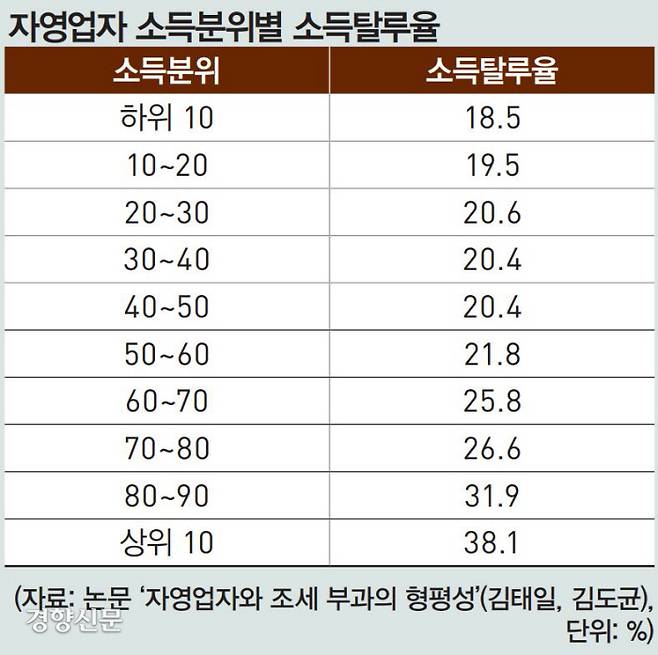 논문 ‘자영업자와 조세 부과의 형평성’은 “고소득 자영업자의 소득세 탈루액이 크고, 소수 고소득 자영업자의 탈세 행태가 언론에 노출되는데, 이를 자영업자 일반으로 확대해석하는 경향이 있다”고 하면서 통계를 제시한다. 소득 분위별 소득탈루율 추정치다. 소득탈루율 추정치는 소득이 높을수록 커진다. 소득 하위 10%의 추정 소득탈루율은 18.5%인데, 상위 10%는 38.1%다.