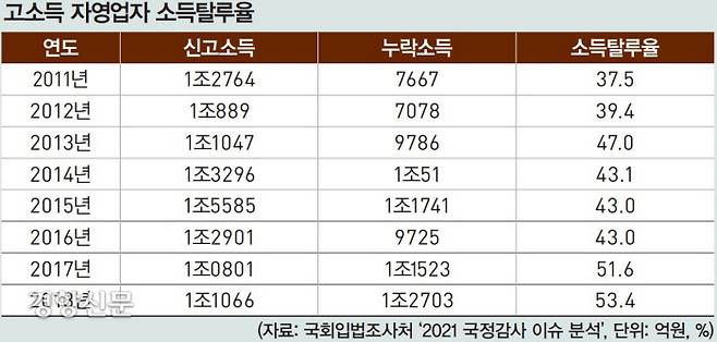 국회 국정감사에서 공개된 ‘고소득 자영업자 세무조사 현황’을 보면, 2019년 조사대상이었던 고소득사업자 808명의 소득탈루액은 1조1172억원이었다. 소득탈루율은 47.6%였다. 벌어들인 액수의 절반을 국세청에 신고하지 않고 빼돌렸다는 뜻이다. 최근 고소득 자영업자의 소득탈루율은 50% 수준을 유지하는 추세다. 국세청 관계자는 “조사 대상인 고소득 자영업자는 보통 한해에 600~800명 수준인데, 이들의 탈세액이나 규모가 전체 자영업자에게 적용된다고 보기는 어렵다”고 했다.