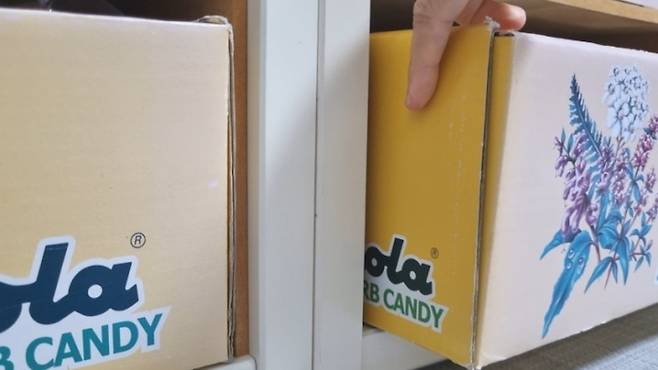저는 코스트코에서 가져온 리콜라 박스를 수납상자로 활용하고 있어요. 원래는 이렇게 산뜻한 노랑이었는데 10년째 사용하다 보니 색이 많이 바랬어요;;