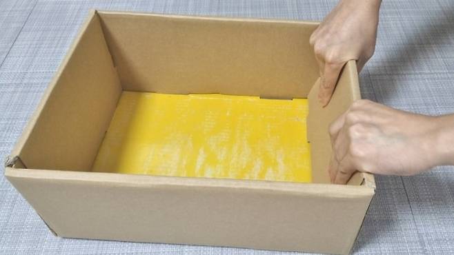 뜯은 상자를 뒤집은 다음. 글루나 양면테이프를 사용해 붙여줍니다.