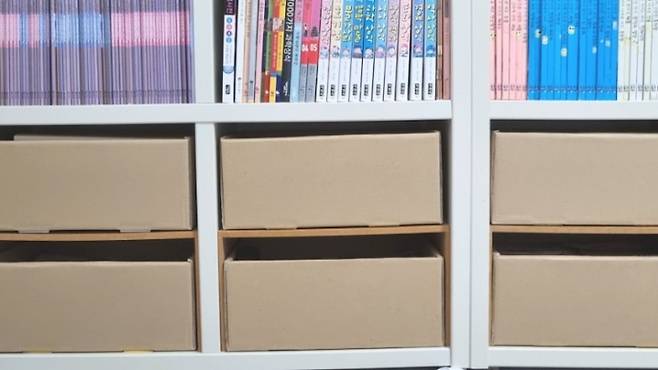 이 상자도 뒤집어서 다시 정리해 볼게요. 뒤집어서 다시 접어줘요. 10년이나 썼는데도 여전히 튼튼하고 책꽂이에 2개가 맞춤처럼 딱 맞게 들어가서 버릴 수가 없어요😊
