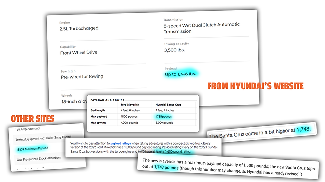 만약 도어 스티커 정보가 사실이라면, 이는 공식적으로 표기된 수치보다 150kg 가량 낮은 적재용량이다. 경쟁 차량인 매버릭의 도어 스티커에는 공식 수치보다 살짝 높은 1519파운드(689kg)가 표기돼 있다는 점에서, 싼타크루즈는 심지어 포드 매버릭 보다 낮은 수치를 보이는 셈이다.