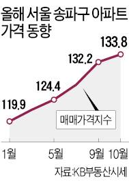 송파구 일대 아파트 가격 상승세는 지속되고 있다. KB부동산 시세 통계에 따르면 올 들어 서울 송파구 아파트 월별 매매가격지수는 계속 상승세다. 1월 119.9에서 꾸준히 올라 7월 127.5를 기록했고 9월 132.2로 상승폭이 커졌다. 지난달에는 133.8을 기록했다.