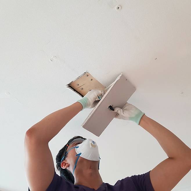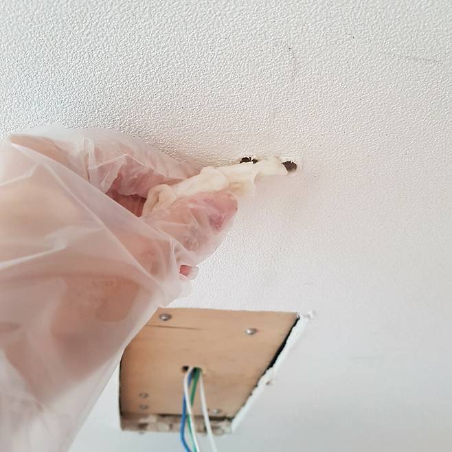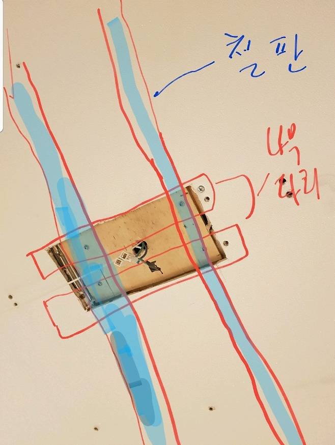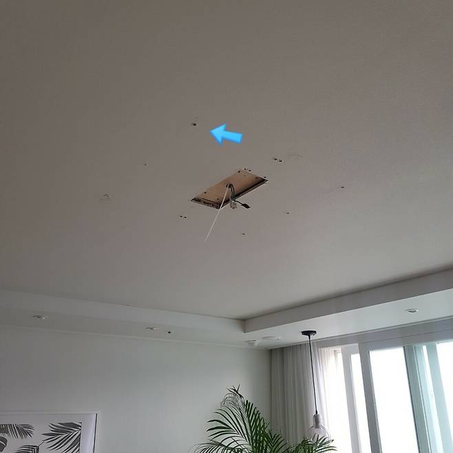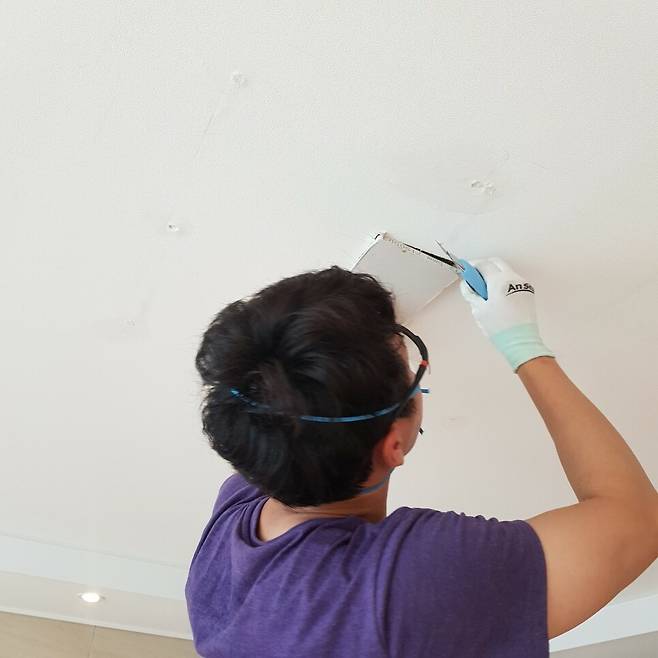 천장보강을 튼튼하게 해주고나서 보니 기존 LED 등이 달려있던 나사구멍이 너무 잘보이네요ㅠㅠ 이 구멍을 메워주겠습니다!