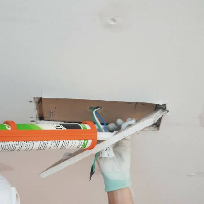 아까 천장을 나무로 보강하고 나니 기존 천장과 단차가 생겨 실링팬을 안정적으로 달기가 힘들어보이죠? 그래서 석고판을 실리콘으로 붙여서 덧대어주었습니다.