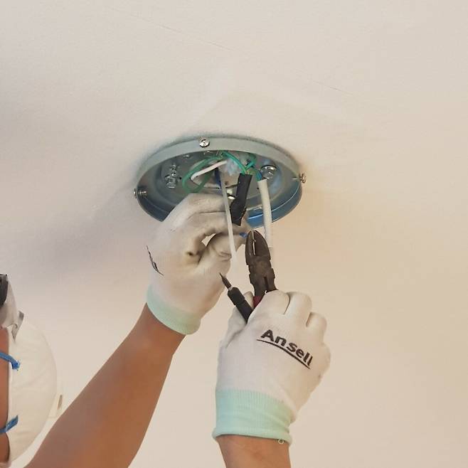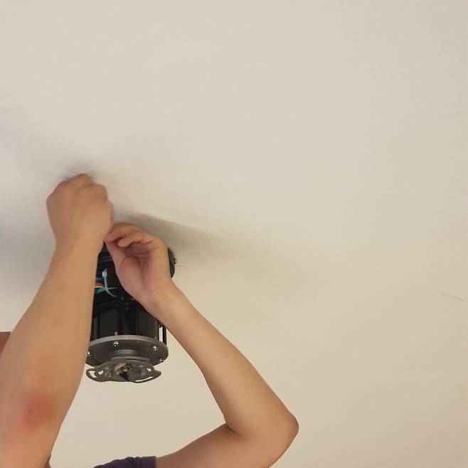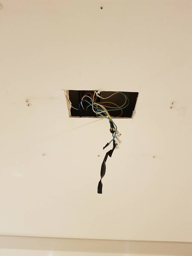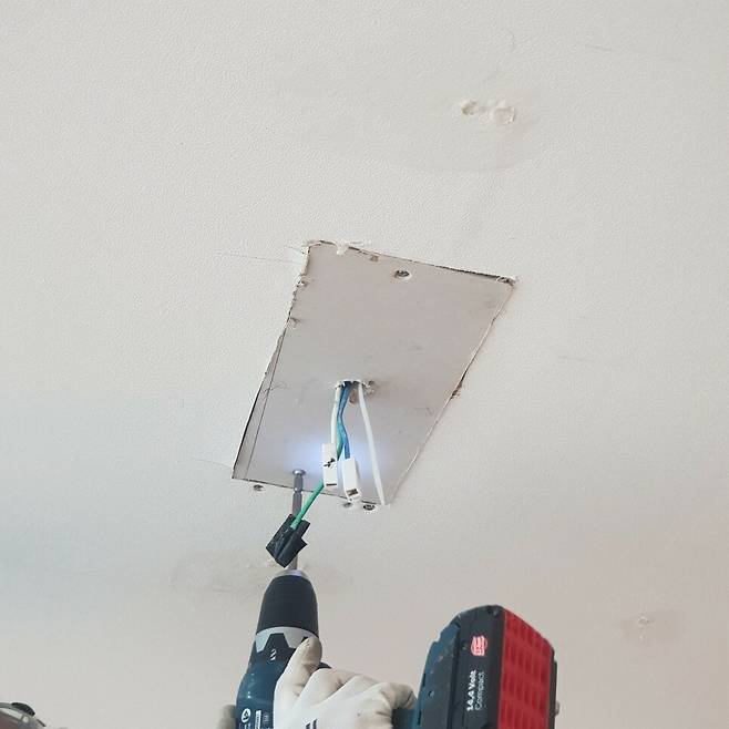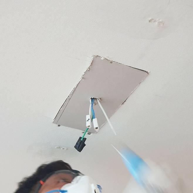 일단 거실 천장 중심에 있는 LED등을 뗐어요. 중앙 LED 등을 떼고 전산을 모아 정리해둔 뒤 천장을 크게 잘라줍니다. 천장에 보강할 나무판을 넣기 위해 입구를 확보하는 것이에요.