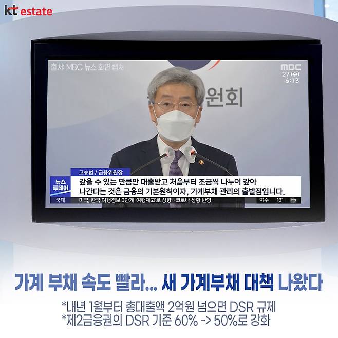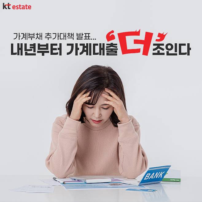 /[Remark]주목해야 할 부동산 정보/ 정부가 최근 가계부채 추가 대책을 발표한 가운데 내년부터 대출 규제가 더 강화될 전망입니다. 앞으로 은행에서 돈을 빌릴 수 있을지 불안해하는 사람들이 많은데요. 특히 내 집 마련을 계획했거나 전세 계약을 앞둔 실수요자들의 불안감이 커지고 있습니다. 이번 가계대출 규제 내용을 KT에스테이트에서 하나씩 살펴봤습니다.