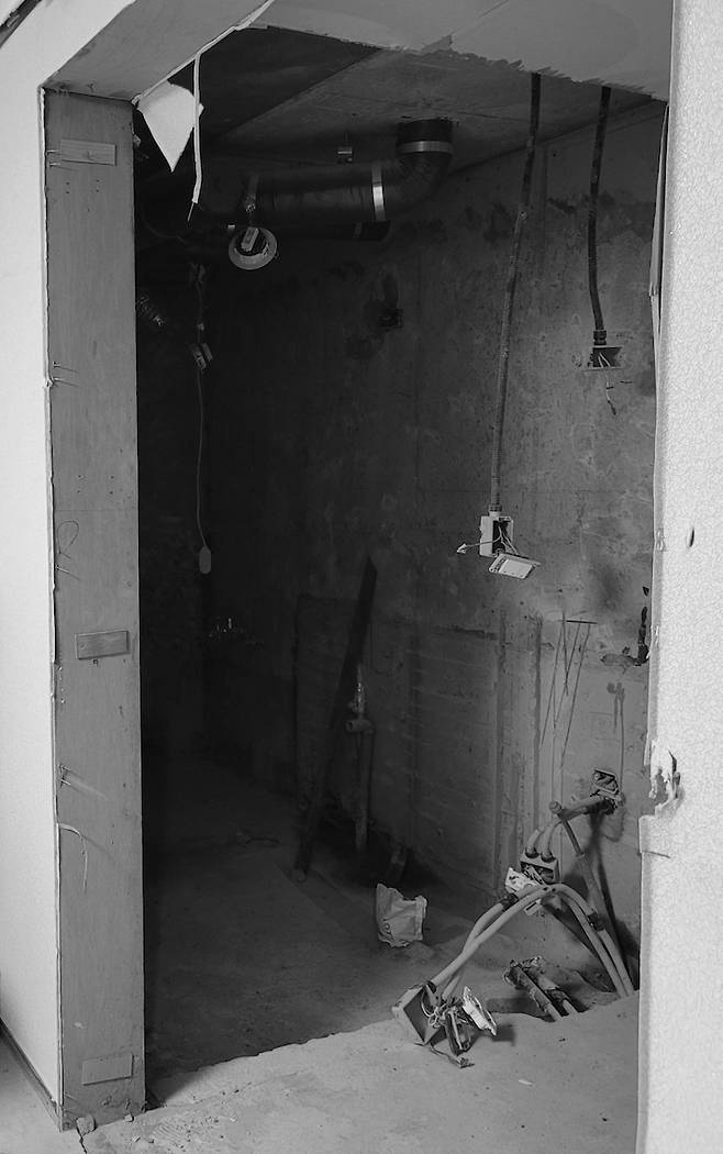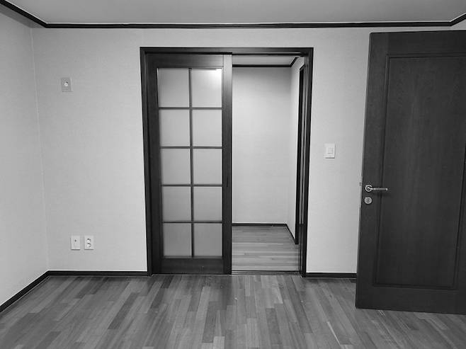 파우더룸 입구! 기존의 큰 미닫이문의 반을 가벽을 세우고 TV를 놓을 수 있도록 공간을 만들었다.