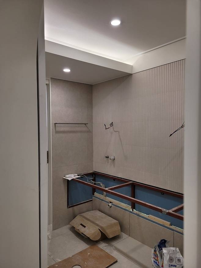 위에서도 얘기했듯 욕실 천장의 거대한 배관으로 인한 난관에 부딪혀 높이 조절 실패하고 기존의 욕실 구조에서 사이즈를 조절하면서 천장 높이 단차를 둬야 하는 상황을 맞이했다.