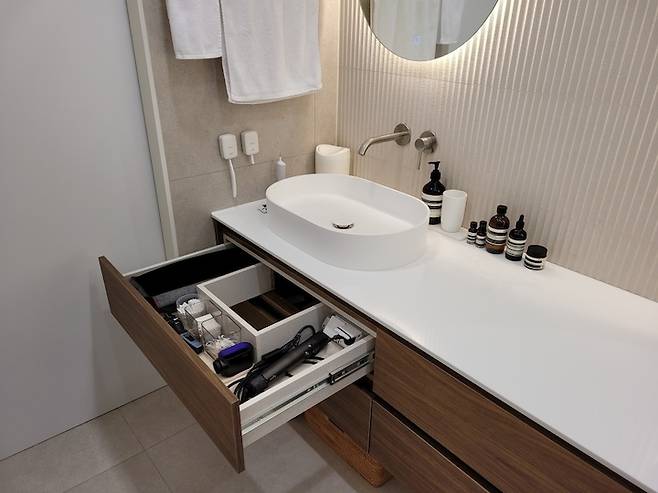 세면기 쪽은 배관이 있어 수납을 많이 못 하지만 서랍 안쪽으로 콘센트를 만들어 드라이기나 면봉, 솜 등을 넣어 정리했다.