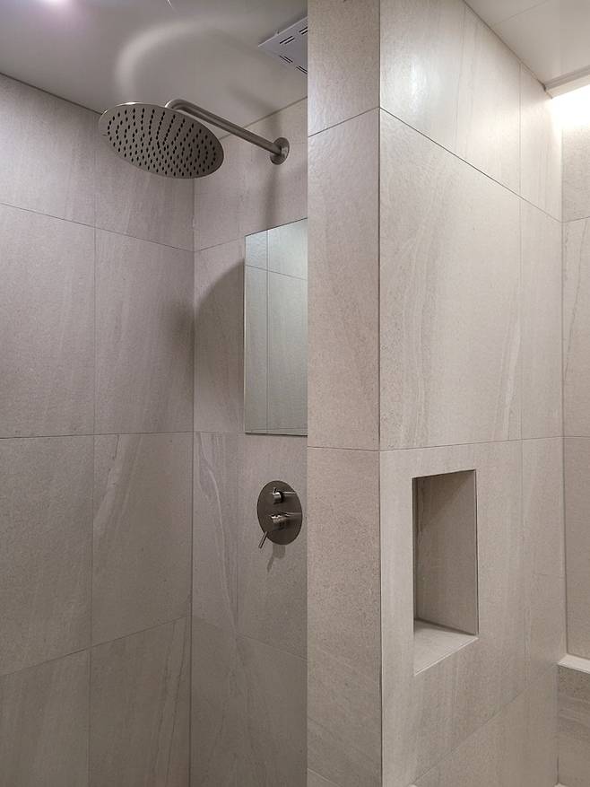 기존에 투명 유리로 파티션이 있었고 20년 된 분홍색 타일이 자리 잡고 있던 샤워부스를 조적 파티션과 매립 해바라기 샤워기로 세련됨을 장착해 주었다.