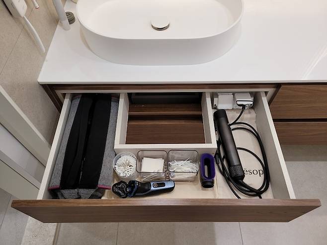 세면기 쪽은 배관이 있어 수납을 많이 못 하지만 서랍 안쪽으로 콘센트를 만들어 드라이기나 면봉, 솜 등을 넣어 정리했다.