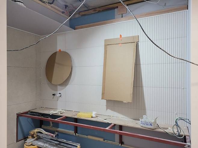 모두가 당황했지만 잘 해결했다, ㅎㅎ 그런데 매립 수전 후기를 보니 이런 경우가 정말 많더라! 조적 욕조를 만든다면 꼭 이 부분 더블 체크하길 바란다!