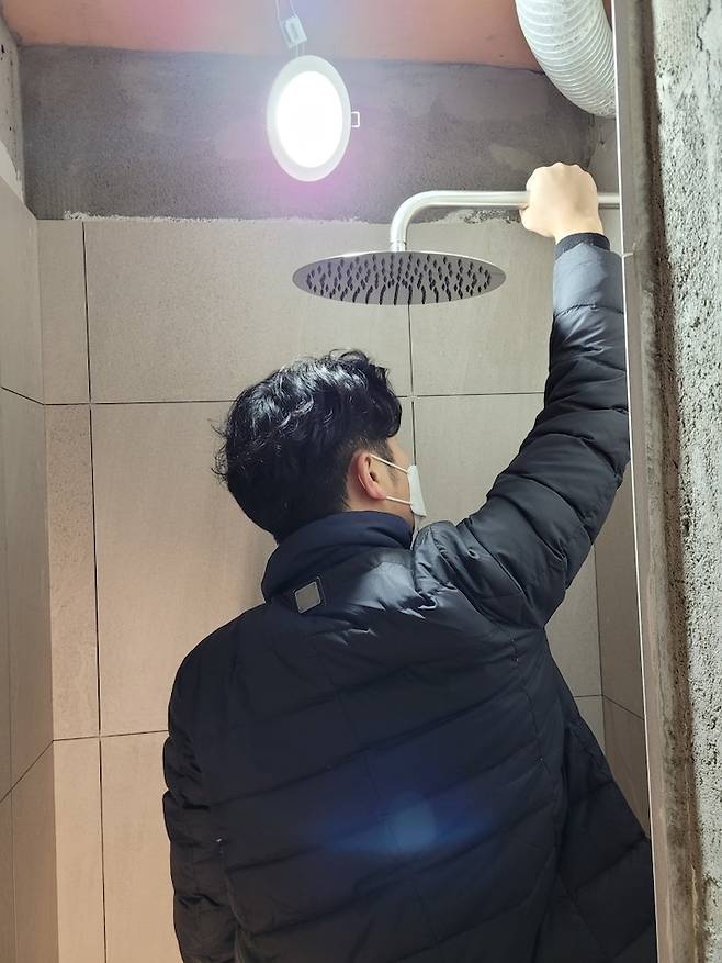 오래된 아파트 천장은 낮은 편이라 해바라기를 천장에 딱 붙여서 매립하지 않는 이상 조금 낮아 보일 수 있다는 것!! 우린 천장에 딱 붙여서 매립하는 걸 선호하지 않아서 조금 내려서 매립을 요청했었는데 이게 웬일 남편 머리를 해바라기 샤워기로 두피 마사지 받으며 하게 생겼다.